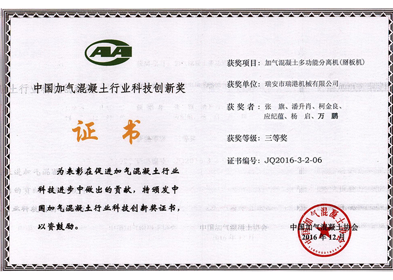 2016年中國加氣混凝土行業(yè)科技創(chuàng)新獎-分離機